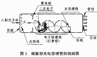 光电倍增管是一种真空器件。它由光电发射阴极(光阴极)和聚焦电极、电 子倍增极及电子收集极(阳极)等组成。典型的光电倍增管按入射光接收方式可分为端窗式(图3)和侧窗式(图2)两种类型。图1所示为端窗型光电倍增管的剖面结构图。其主要 工作过程如下:当光照射到光阴极时,光阴极向真空中激发出光电子。这些光电子按聚焦极电场进入倍增系统,并通过进一步的二次发射得到的倍增放大。然后把放 大后的电子用阳极收集作为信号输出。因为采用了二次发射倍增系统,所以光电倍增管在探测紫外、可见和近红外区的辐射能量的光电探测器中,具有极高的灵敏度 和极低的噪声。另外,光电倍增管还具有响应快速、成本低、阴极面积大等优点。