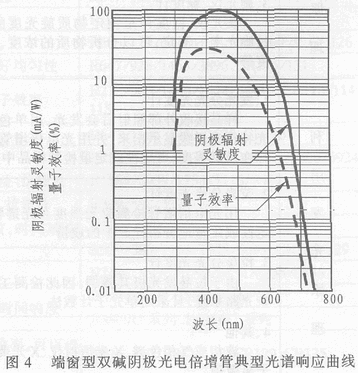 图4给出了双碱光电倍增管(其光阴极材料为Sb-Rb-Cs和Sb-K-Cs)的典型光谱响应曲线。